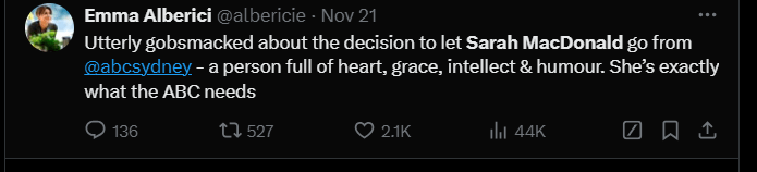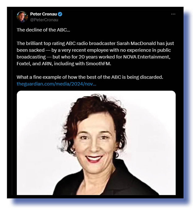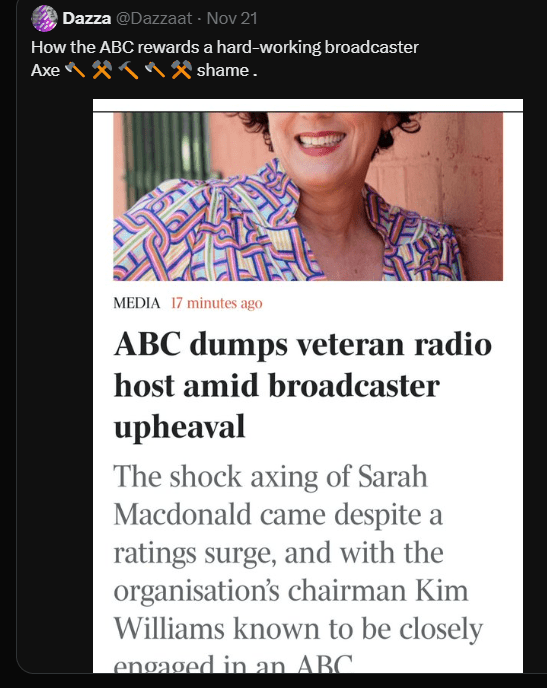 We know bugger all about why Sydney ABC radio broadcaster Sarah Macdonald was terminated recently. We know nothing of her and we haven’t heard her on air. But we did notice the enormous about of Excreta that plopped into our prize barrel in her defence.