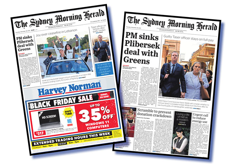 Take today’s SMH. Below are page 1 on the left and page 3 on the right.