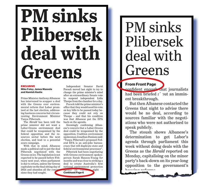 So what did our bright-eyed down-table sub do last night when processing the PM sinks Plebersek story that flowed over to page 6 from that page 3?