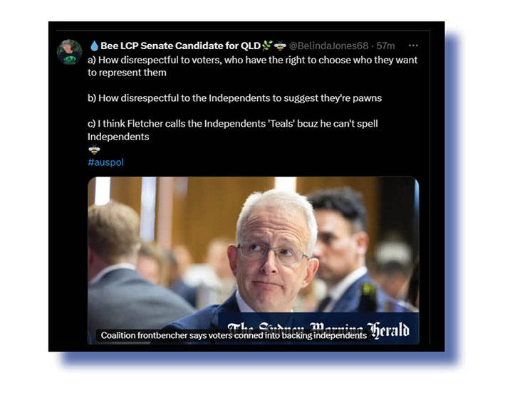 Fletcher, sitting on a very slim margin in his HofR seat, got stuck into independents who he reckons are ruining politics in this country. Take it away, Kate Chaney, BeeLCP, etc, etc, and Terry Sweetman.