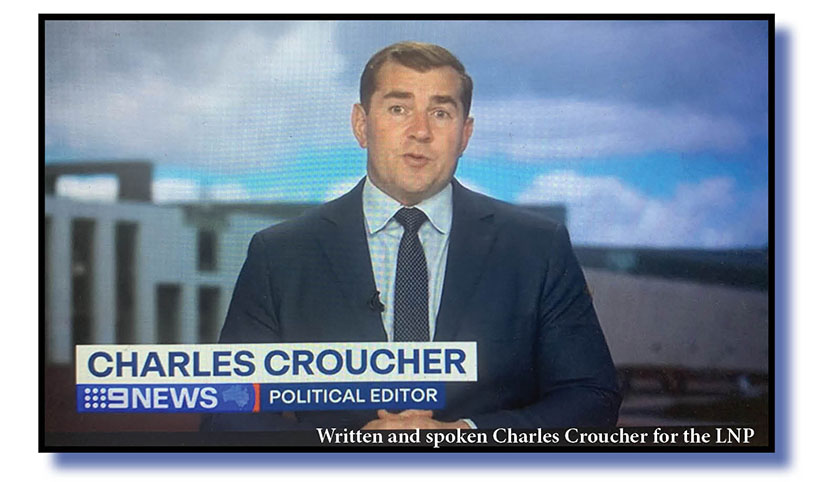Can you start to see why we at The Bug reckon Croucher’s piece, to conform with electoral laws, should have had “Written and spoken Charles Croucher for the LNP” at the bottom of the screen? There’s no doubt that the right-wing powers that be at Nine News and the wider Nine Entertainment Co. management would have been delighted with what Croucher has achieved here. How nice of Croucher to give three bites of the political cherry for the LNP; one for Labor.