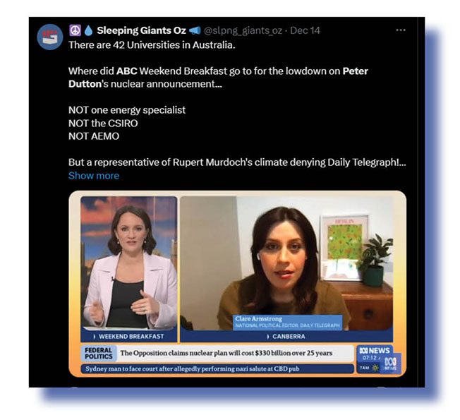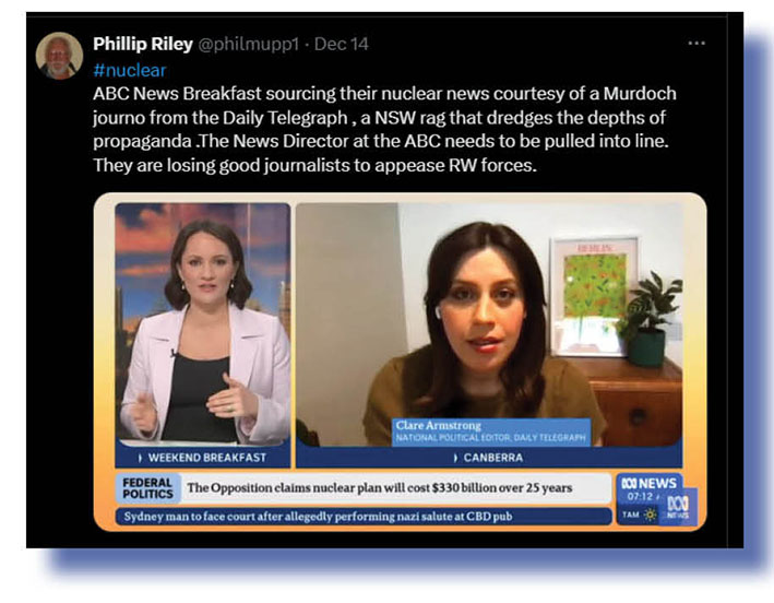 Other Xers made the same point that there were all sorts of nuclear power experts ABC Weekend Breakfast could have got on, instead of someone from Newscorpse, with its pathological hatred of the ABC and its totally biased and unprofessional approach to politics reporting, even though it could be argued Clare Armstrong is among the best of a bad bunch.