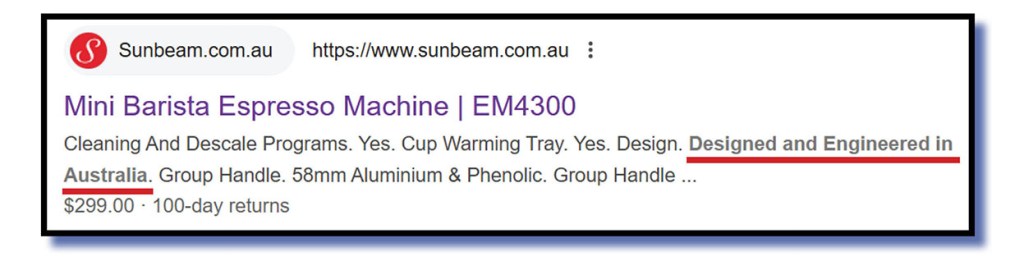FOUND IT! Sunbeam’s “designed and engineered in Australia” boast, albeit for a different compact barista expresso machine model! Anyone want to guess where this one was made?