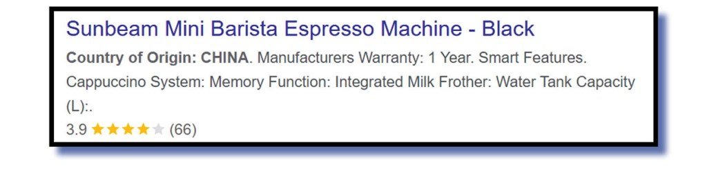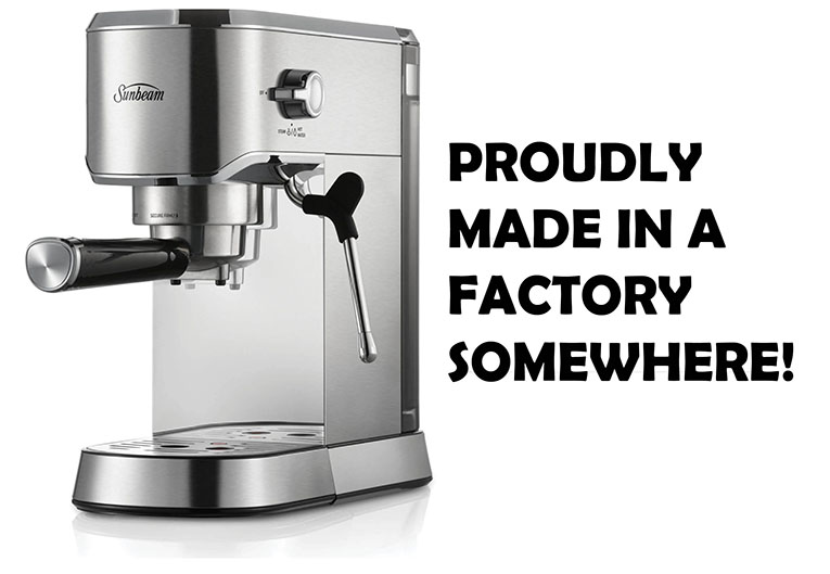 So we googled “where is Sunbeam’s new compact barista espresso machine made?” and you could have knocked us all down with just the one well-aimed feather when it came back with China!