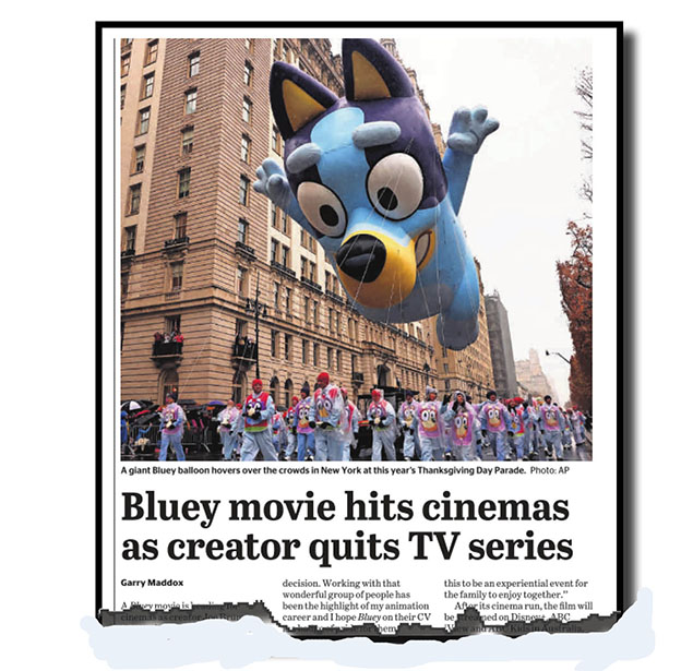 The bitter, washed-up, old hacks who compile this column hate the sight of disappointed kiddies’ faces. So a word of warning for Bluey fans, be they parents or their children. Please don’t rush out to your local cinema now on the basis of this heading in today’s (Saturday’s) The Sydney Morning Herald (above and below).