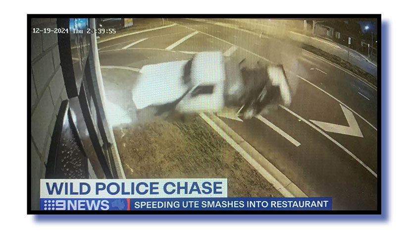 Also from Nine News Queensland on Friday night came the story of a ute that smashed into a suburban Melbourne restaurant. Its driver who was trying to outrun a cop car escaped unhurt and fled on foot but here’s the piece we object to… “police eventually arrested the 29-year-old”.