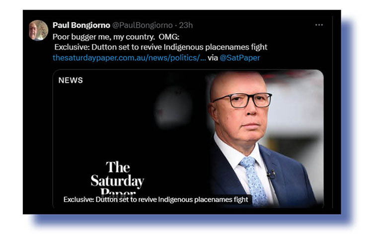 Let’s hear from Paul Bongiorno as Dutton added indigenous placenames to his racist hit list, JayJay and GregMarSki …