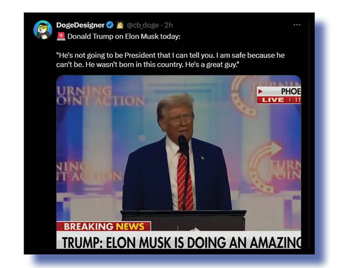 Diaper Don’s displeasure over this mischief is understandable from the world’s greatest ever leader ever. Everyone knows that. Yet, Trump stupidly – and no-one in the world knows more about being stupid than he does – showed his anger in public by waffling on that Musk can’t ever be president. So there! DogeDesigner was one of many who picked up on that.