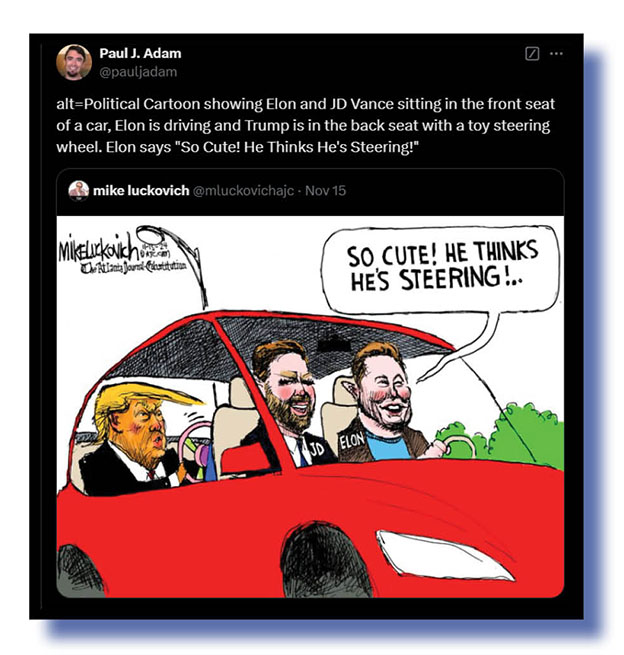 And the contributions shown above and below from Paul J. Adam and Harry Sisson sum up the displeasure being shown by the best golfer the world has ever known, namely memes and jokes that the real 47th president of this-here United States of America will be Elon Musk.