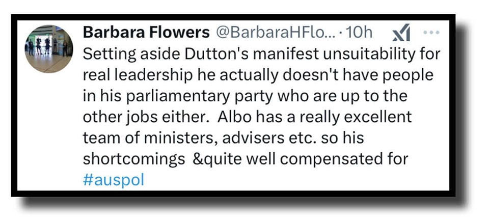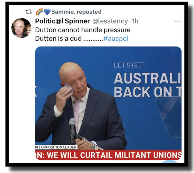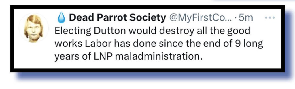 Trust us. If Anthony Albanese had put in the shitty performance Dutton gave us yesterday, the MSM right now would be up him like a rat up a fucking drainpipe. They’d be declaring it the Albo gaffe that ended his bid for a second term. Each and every Sky LNPNews host would be having conniptions. Andrew Bolt would be demanding four pages for his bullshit takedown of weak, woke, Albanese!