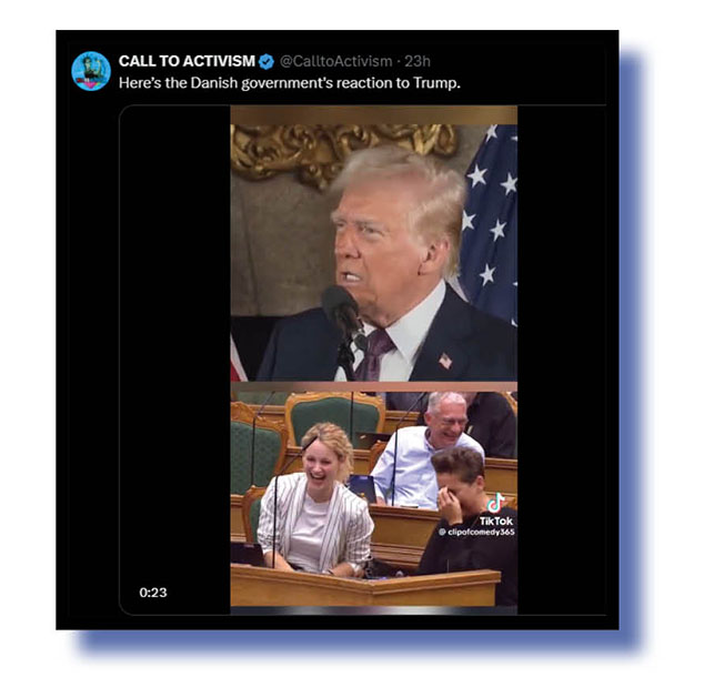 Our judges particularly like the effort (above and below) from CALL TO ACTIVISM, supposedly showing the Danish parliament’s response to Trump’s declaration that Greenland needs to become part of the US, taken by force if need be.