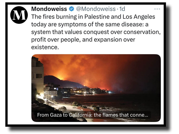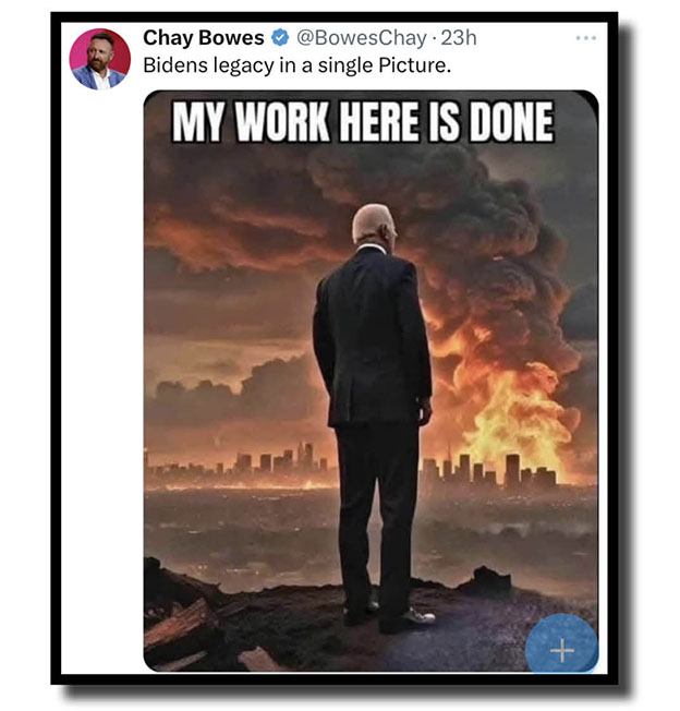 We’re assuming Chay is blaming Biden for the Los Angeles fires. There are high-rise buildings still visible in the background, so it’s obviously not Gaza that Biden’s bombs have helped raze.