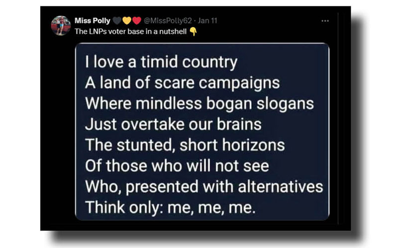 Finally, some domestic politics and without any explanation because time is short, here are Dr Monique Ryan MP, Wazza from Melbourne, the Noisy Elephant and Miss Polly with a nice little poem.