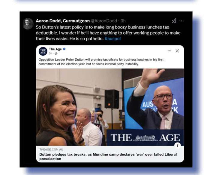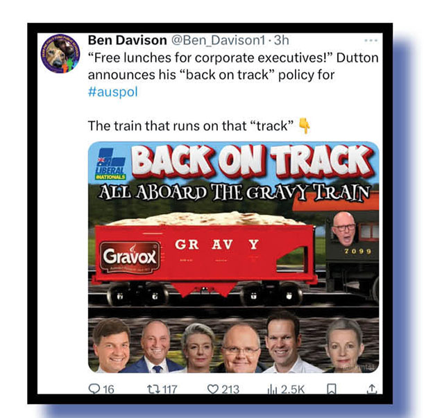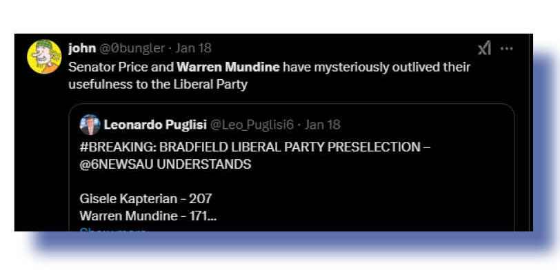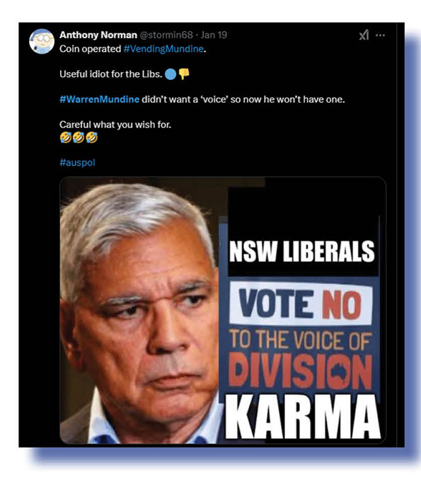 Before we move on, let’s all remember that Mundine and Price spearheaded the No argument at the 2023 Voice referendum, a racist and divisive effort full of lies. And that a weak and gutless Peter Dutton stayed largely silent as they did the dirty work for him. And not one “journo” in this nation’s mainstream mediocre made any real effort to pin down Dutton and ask what he thought of the general racist and divisive No campaign as it was rolled out.