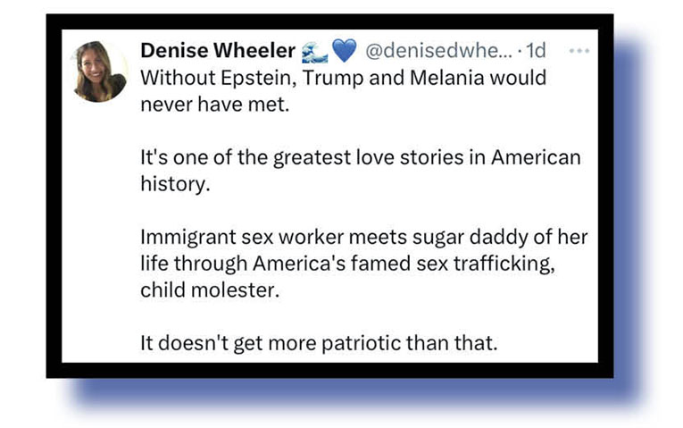 Before we move on, The Bug wants to make it crystal clear that we’re only running Denise’s xcretal outburst because it’s funny. We have no idea at all as to whether Melania Trump ever was an immigrant sex worker. So please don’t sue us, Melania! We hope you’ll be too busy making billions with your Melcoin and fashion range already brimming with success to bother with little old us. Oh, and by the way, we’re broke!