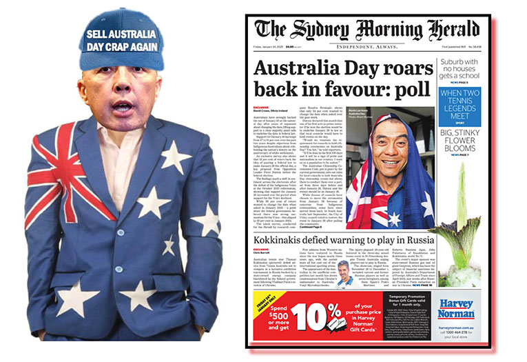 It showed support for January 26 – today – as our national day “leapt” from 49 per cent to 61 per cent. Of those polled, 52 percent backed the idea of a federal law to make January 26 the official day. The SMH article gleefully pointed out as quick as it could that this was “a key proposal” of Opposition Leader Peter Dutton.
