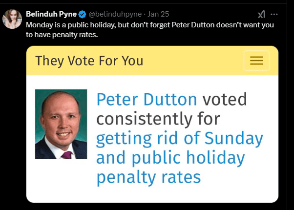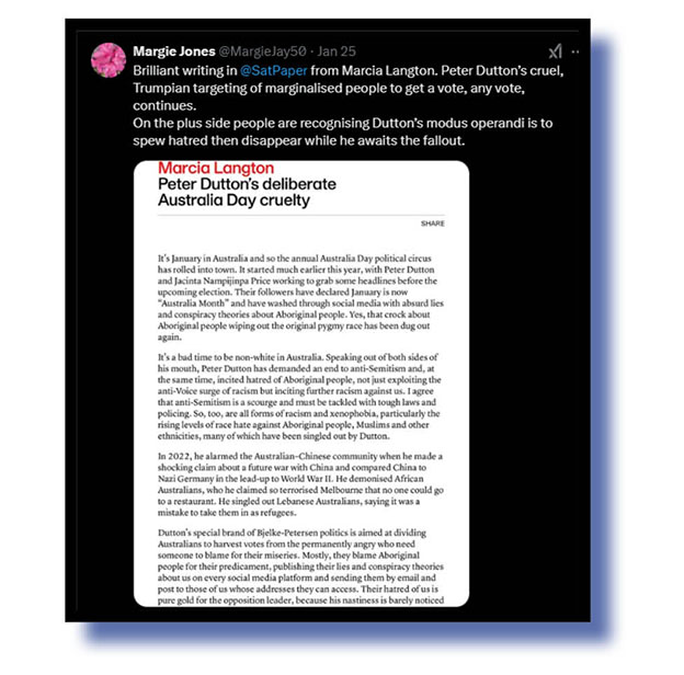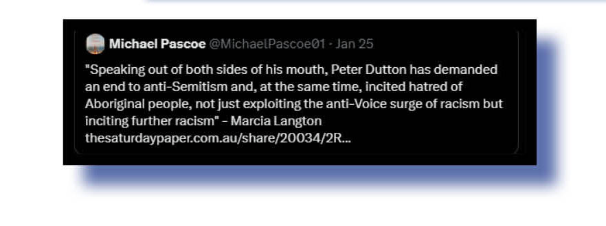 Onto domestic politics now and Peter Dutton’s new job offer for Jacinta Price, presumably as a reward for all the lies she spewed at the Voice referendum, drew the ire of Aaron Dodd, Curmudgeon, blakandblack and Judith Nunn.
