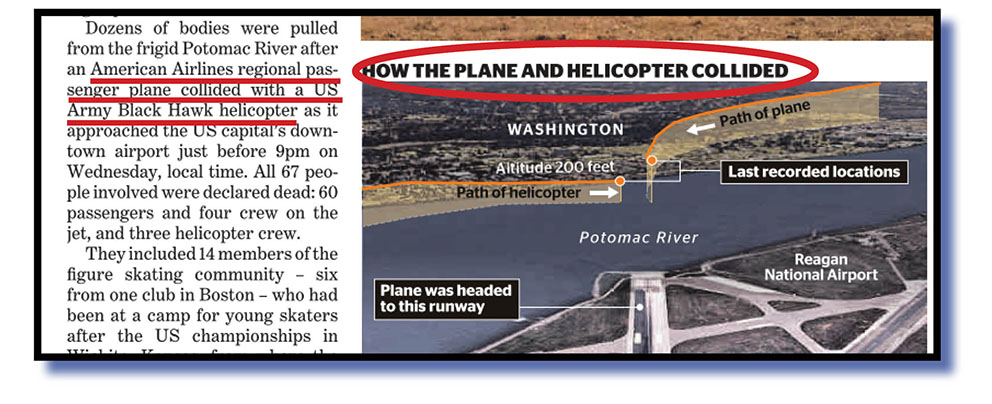 Mediocre Bytes lost count on the number of times this silly old rule of journalism was breached in print and electronic media reporting on the deadly collision. The military Black Hawk helicopter also did more than its fair share of colliding with. Regardless, that’s four! (And kudos to the graphic artist who got it right).