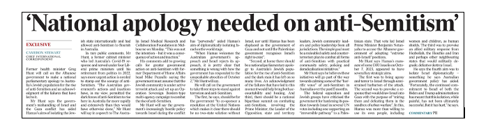 Former Liberal Party federal health minister Greg Hunt has been criticised for allegedly embarrassing Opposition Leader Peter Dutton by planning to call for a national apology in the federal parliament from the Albanese Government over its response to anti-Semitic attacks. (below)