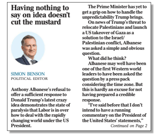 Our MGH teams have noted that ever since Trump belched forth his Gaza goal, News Crap Australia’s Righters have gone out of their way to lambast Prime Minister Anthony Albanese for allegedly not rushing to give his opinion on the US President’s bright orange hare-brained scheme.
