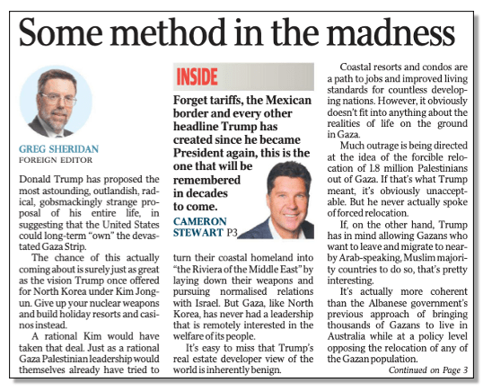 Here the usual far right-wing News Crap columnists such as Andrew Bolt, Greg Sheridan, and James Morrow (main picture) were busy turning out columns that, as usual, defended, excused, and promoted Trump and his gaga Gaza idea.