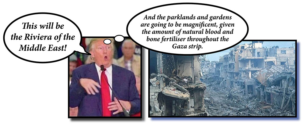So while flouting international law and openly advocating ethnic cleansing on a massive scale, on top of the genocide Netanyahu and his Zionist government have committed in Gaza with the help of a never-ending supply of American bombs, is more in keeping with the Trump we’ve come to know and loathe, spelling out his plans for Gaza is probably the first time in his life he’s displayed openness and honesty about the unlawful, anti-democratic and self-serving way he prefers to go about doing things.