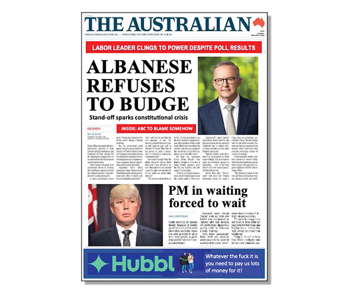 “The paper’s coverage today expresses outrage at Mr Albanese’s refusal to immediately quit as PM and hand the office over to Mr Dutton,” said Professor Jonningham, chair of the Combined Universities Newswriting Tribunal.