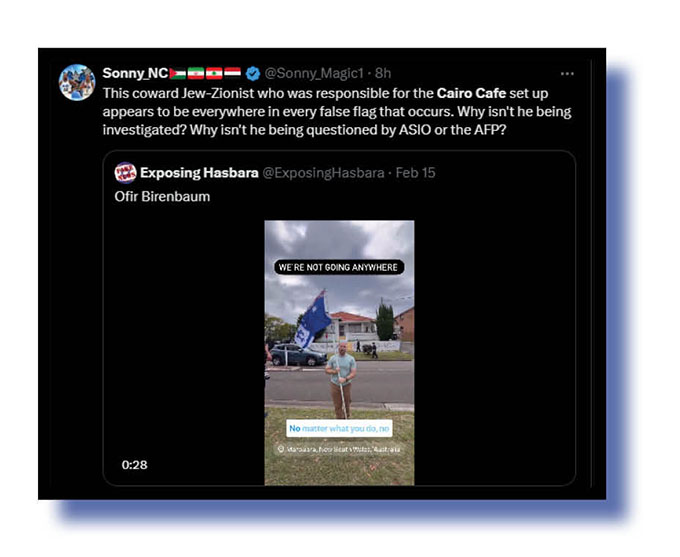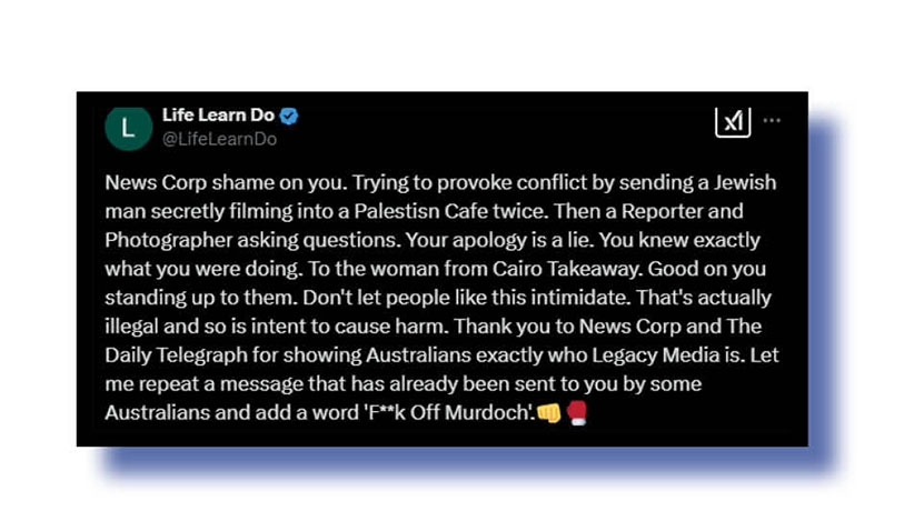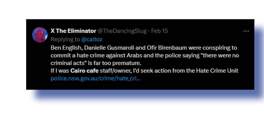 Ok, now onto that Daily Telegraph stunt where a reporter and cameraman waited outside while a Zionist wearing a Star of David cap allegedly tried to provoke some anti-Semitic responses from the owners and staff of the Palestinian-supporting Egypt Takeaway/Cafe in Sydney.