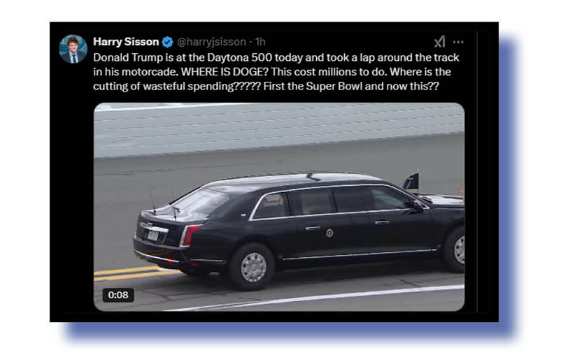 Speaking of Demented Don, Harry Sisson and Carlos Turnbull were among many who highlighted the convicted felon’s appearance at the Super Bowl and Daltona as wastes of money, seeing Trump and co-president Elon Musk are hellbent on slashing government services to fund “uge” tax breaks to people such as themselves!