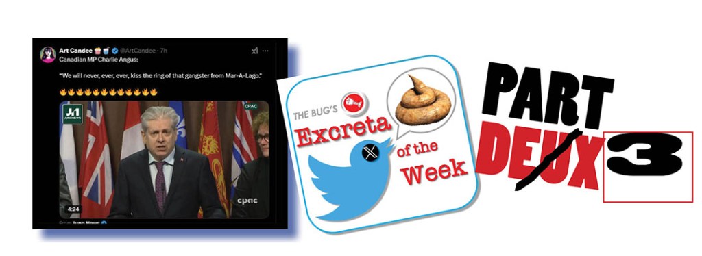 Sorry for this very late – and rare third – edition of The Bug‘s Xcrements of the Week! We got sidelined for a few days over silly Australian domestic politics, such as that useless lump of lard Clive Palmer starting a far-right political party and shamelessly milking the far right words Trump and Patriots for what we all fear come election time will be quite a bit of what he’s worth.