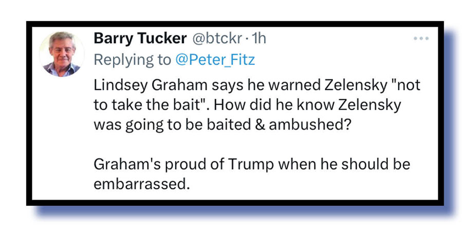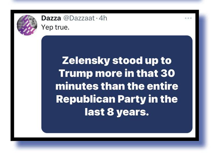 Okay, let’s finish up with showers of excrement from various folk on a range of topics that sprung from that disgusting tag-team bullying of Zelenskyy in Washington.
