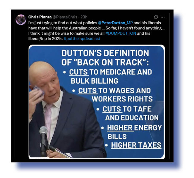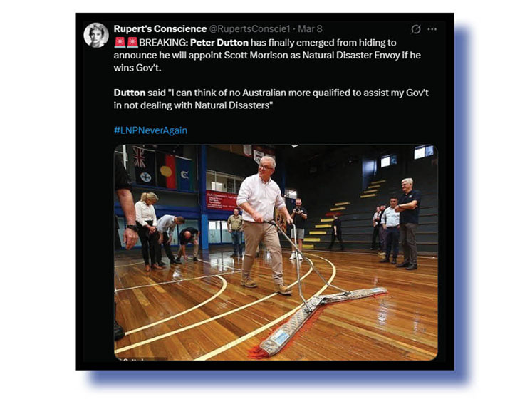 So, without further ado, let’s once more give Dutton the shit toupee he so richly deserves by kicking off with Baz The Aussie (at top and below) xcreting hard with a nice little meme that we suspect alludes to Dutton’s rush to Sydney for a Liberal fundraiser barely two days before frightened residents in his Dickson electorate were expecting Cyclone Alfred to pass just about right over them.