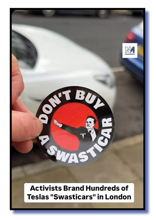 A public salute by Musk that some interpreted as a sieg heil led to activists in London slapping stickers on Tesla vehicles calling them swasticars. (pictured).