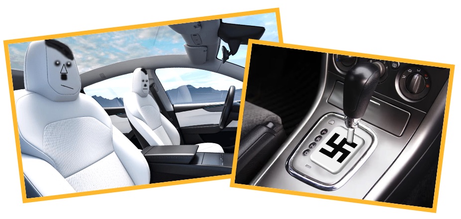 STOP PRESS: Musk overnight has announced that the Hitler will shortly be available as a hybrid model, meaning it will have a petrol tank, or as Tesla’s vehicle-design engineers term it, a gas chamber.