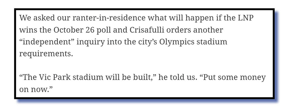That RIR is me! Yes, long before the last state election, long before Premiers Stephen Miles and now David Crisafulli promised no new stadiums – the cost would be shameful with so many Queenslanders facing cost of living pressures, before final reviews, I got it right.