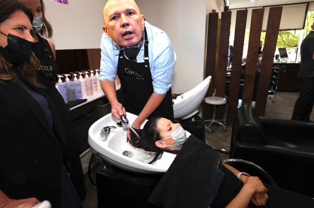 “It’s ridiculous to suggest I’ve got no new ideas,” Mr Dutton said on a flying visit to a Melbourne hair salon where he washed a customer’s hair for the cameras. (main picture)