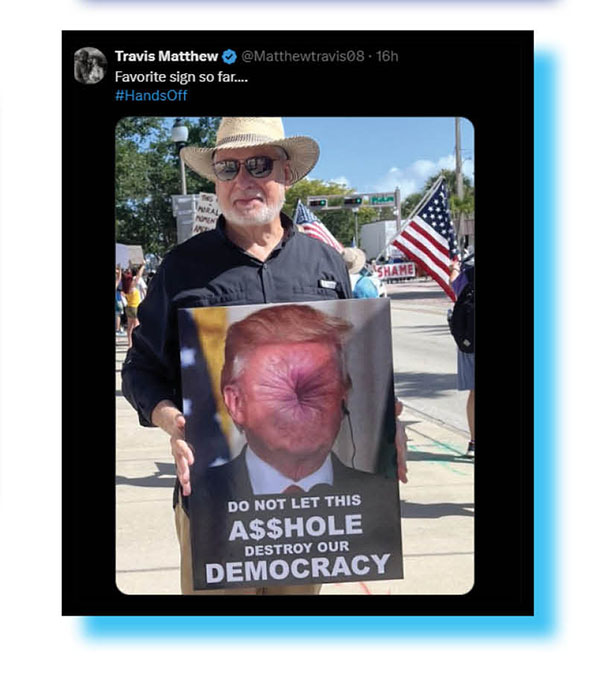 What our judges did like were some of the signs at these rallies, among the best and most cutting shared by Travis Matthew and Damaan, etc, etc, (above and below).
