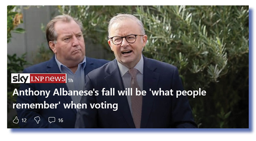 Another whinged on about Albanese lying that he had not fallen. Yes, he did fall and, yes, he is lying but who the fuck cares. That Sky LNPNews is still pushing this nonsense shows its desperation in searching for something solid to bag Labor about. Not a good sign for their beloved LNP.