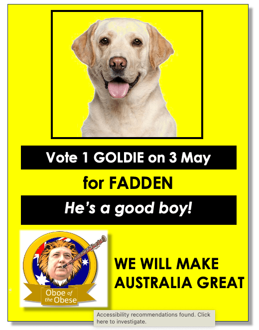 In the Gold Coast seat of Fadden, Mr Palmer’s party has endorsed a golden labrador (below).