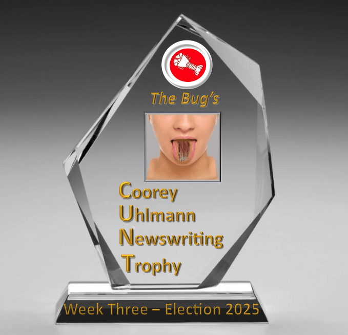 Hope that bucket didn’t overflow too much. The rest of Kenny’s propaganda maintained the pow! bam! whack! theme, with this senior Rupert righter declaring at the end that Dutton had won the debate “handsomely”! You could have knocked down The Bug‘s entire staff with a single feather or one leaf of a very wilted lettuce if he had declared it any other way.