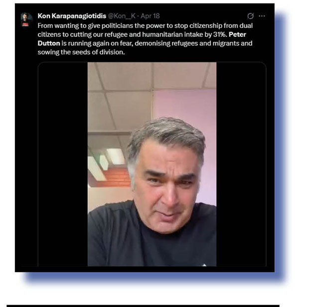 Let’s turn now to other issues Dutton is pursuing as election day comes ever so closer and they have the whiff of desperation about them. Let’s hear from Bo Reider, Kon Karapanagiotidis and Chris, etc, etc.