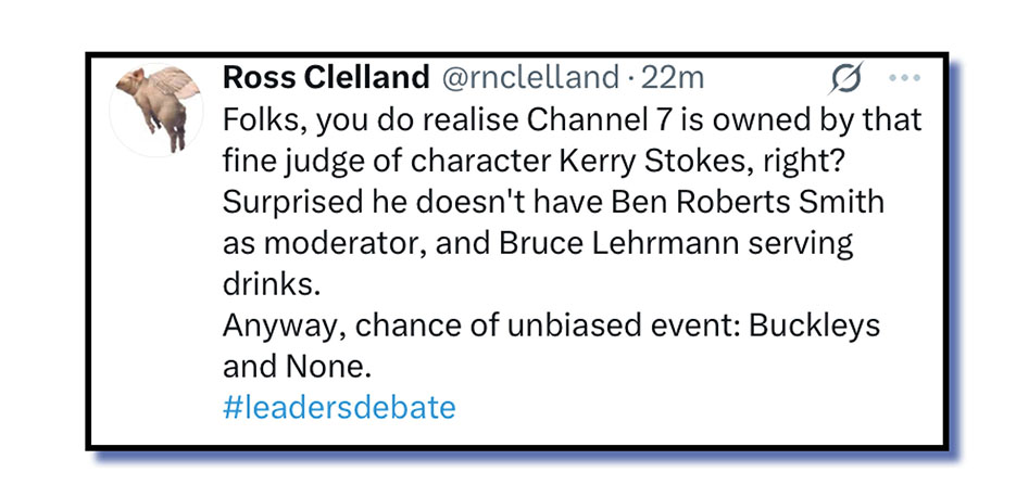 Seeing the Seven Network debate was one of the lowlights on the hustings yesterday, let’s hear from Ross Clelland.