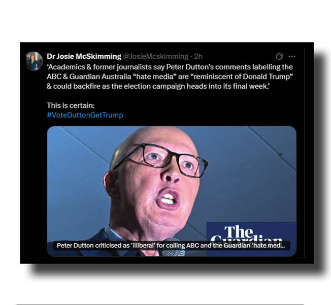 An extra aside from us. Dutton’s campaign advisers must surely have been advising him for weeks now to try to distance himself from Donald Trump. That Dutton with his “hate media” outburst seems incapable or unwilling to so has all of us at The Bug rolling around the floor laughing!