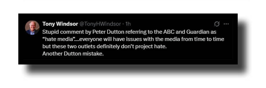 And the ABC, for fuck’s sake! The Bug has written many times over as to how Aunty decided soon after the 2022 election that to be fair and balanced from then on, it had to run Peter Dutton Says on any political issue – a favour never, ever, extended to Bill Shorten and Anthony Albanese as Opposition leaders.