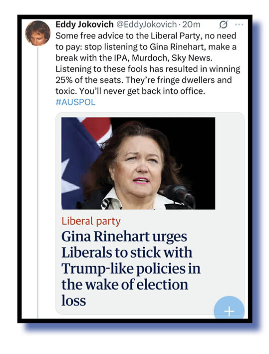 … while Eddy Jokovich, reb of Melbourne, etc, etc, and Colin Richardson suggested the LNP would be wise to stop listening to right-whingers rabbiting on and the mainstream media sprouting about how good they are and by how much they’re going to win by.