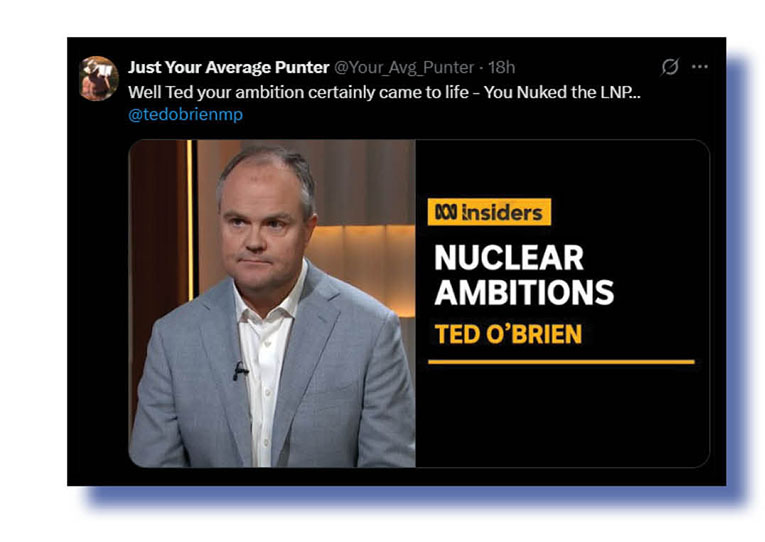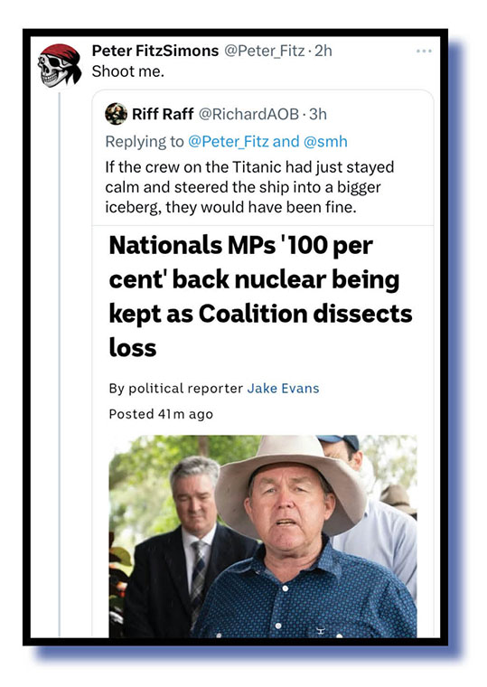 Just Your Average Punter and Peter FitzSimons replying to Riff Raff suggested nuclear power plants really bombed out with the electorate ….,