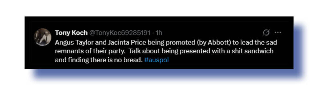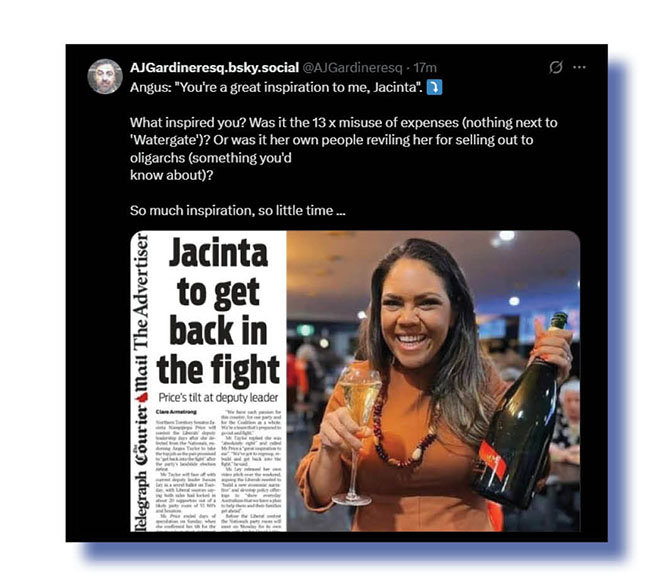 Now onto our favourite contender for a leadership position whose success at that should consign the LNP to Opposition wilderness for at least a decade … Jacinta “unpronounceable middle name” Price.