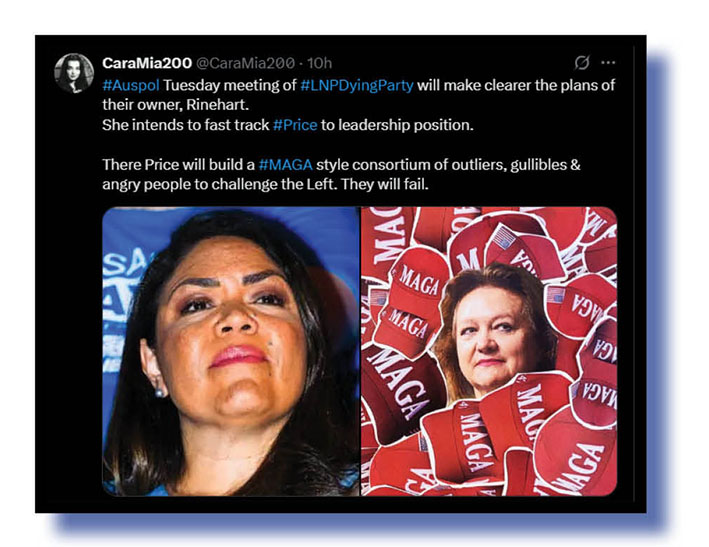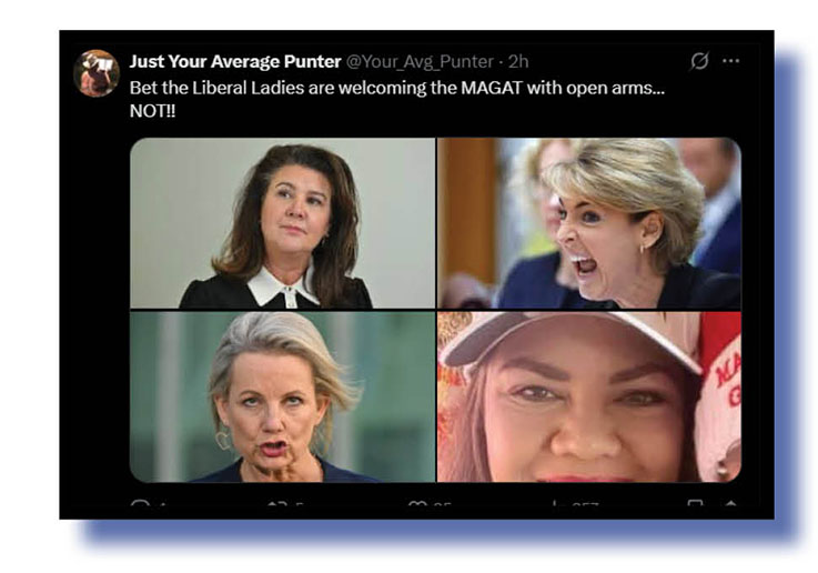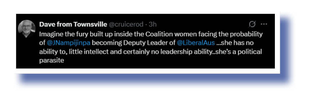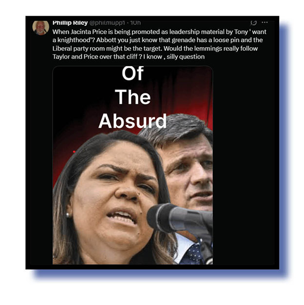 That’s right! The black white supremacist who is now unwelcome in most First Nations communities after leading the racist and divisive No! campaign against The Voice. That Jacinta “My peoples are largely opposed to the Voice!” Price.