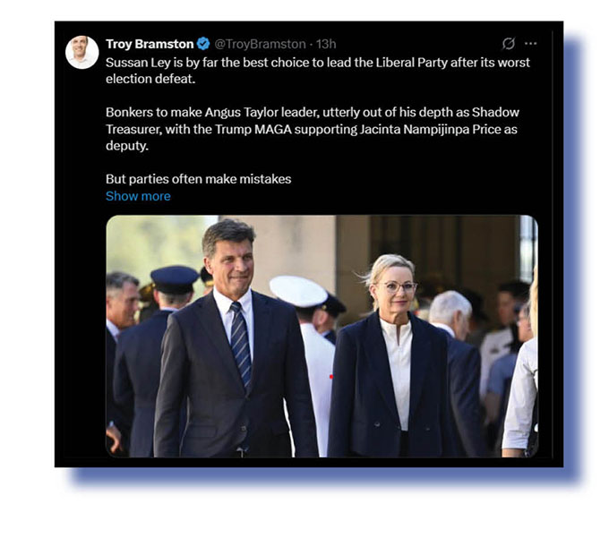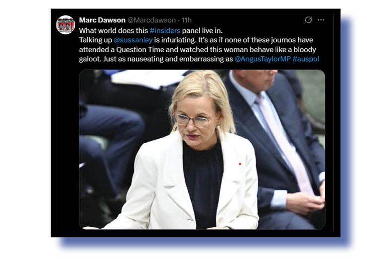 On now to Watergate Angus’s main rival for leadership of the smoldering ruins of the Libs’ once broad church – Sussssan “this goes with that goes with this” Ley. And, by the way, we’re only asssssuming she will lose because she’s a sssheila and we all know what the LNP generally thinks of them.