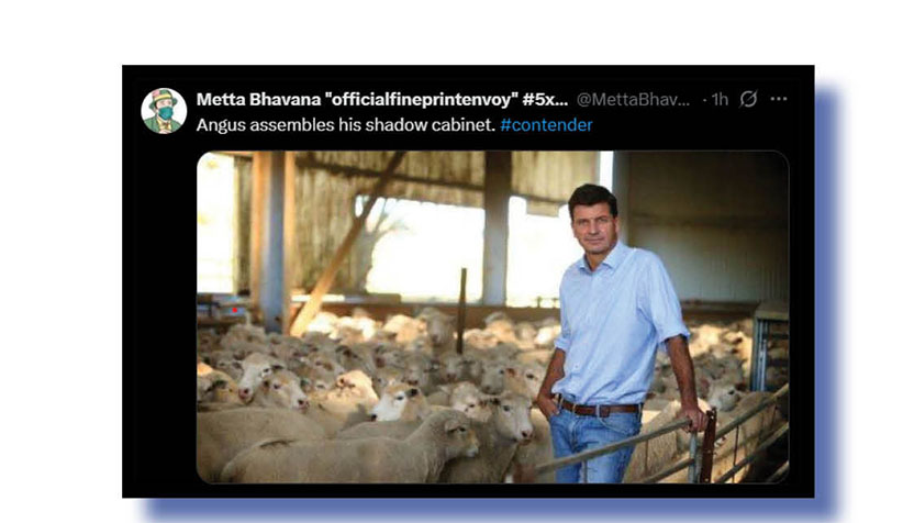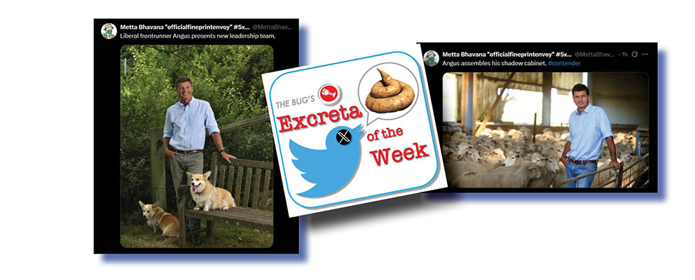 Our judges couldn’t help but focus on the various dopefuls seeking top-dog status in the Liberal and National parties over the next day or two and on that basis decided to highlight the work of Metta Bhavana, etc, etc, (top and below) having fun with who The Bug suspects will lead what’s left of the Opposition.